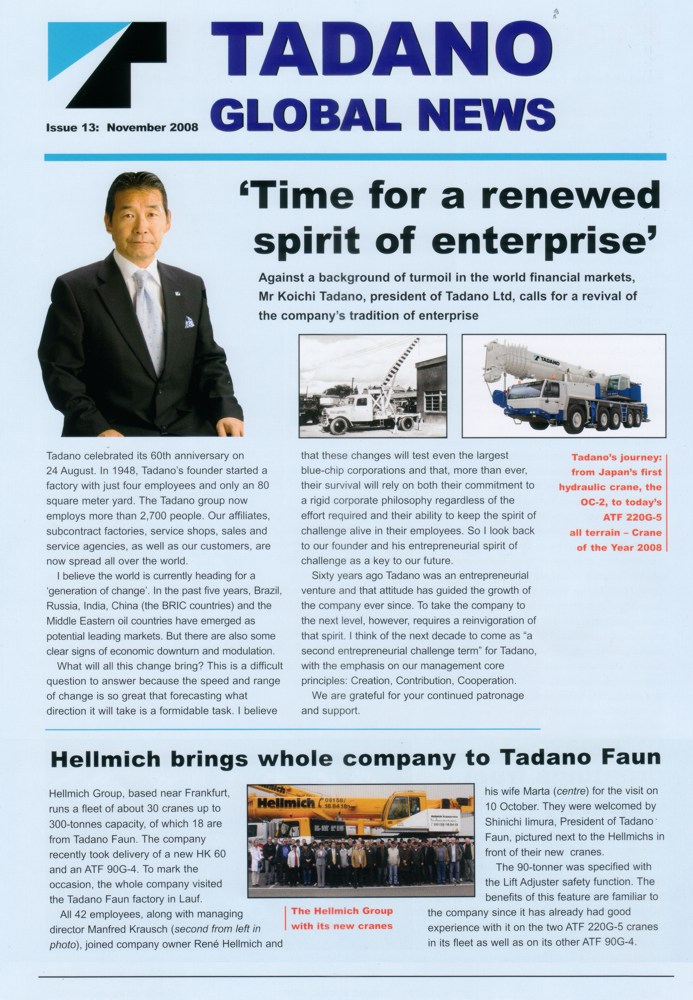 Tadano Global News – November 2008 Tadano Global News – November 2008Hellmich brings whole company to Tadano Faun Bericht der weltweit verteilten Firmenzeitung von Tadano Faun über den Betriebsausflug ins Tadano Faun Werk in Lauf bei Nürnberg. Von G. Heinrich|2023-11-24T09:37:36+01:00November 28th, 2008|Allgemein| Share This Post With Others! FacebookTwitterLinkedInWhatsAppPinterestE-Mail Ähnliche Beiträge Superhelden lässt man “einfliegen”! Gallerie Superhelden lässt man “einfliegen”! November 24th, 2023 | 0 Kommentare Hellmich Kranservice im SAT1-Frühstücksfernsehen Gallerie Hellmich Kranservice im SAT1-Frühstücksfernsehen August 23rd, 2023 | 0 Kommentare Hellmich Kranservice bei ServusTV Gallerie Hellmich Kranservice bei ServusTV August 2nd, 2023 | 0 Kommentare BILD: Der Bürokratie-Kransinn! Gallerie BILD: Der Bürokratie-Kransinn! Juli 5th, 2023 | 0 Kommentare